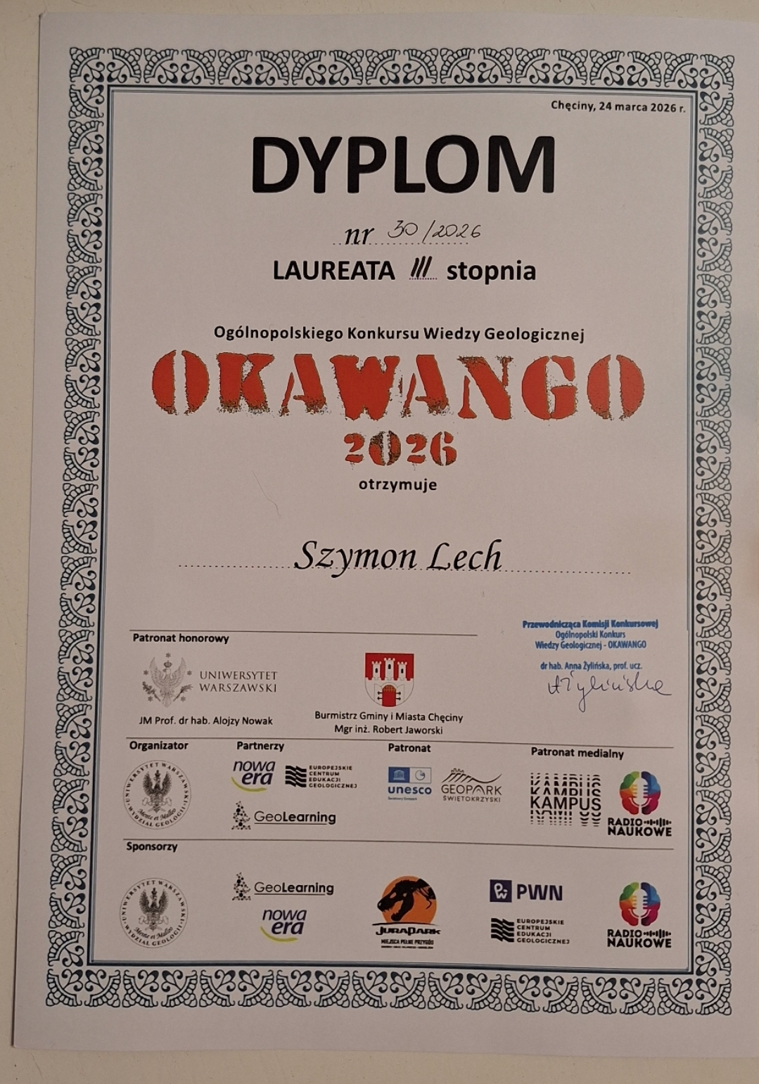 Z dumą informujemy o spektakularnym osiągnięciu ucznia naszej szkoły. Szymon Lech z klasy IV E który realizuje program geografii w zakresie rozszerzonym, wywalczył tytuł laureata VIII Ogólnopolskiego Konkursu Wiedzy Geologicznej „OKAWANGO” 2025/26.
