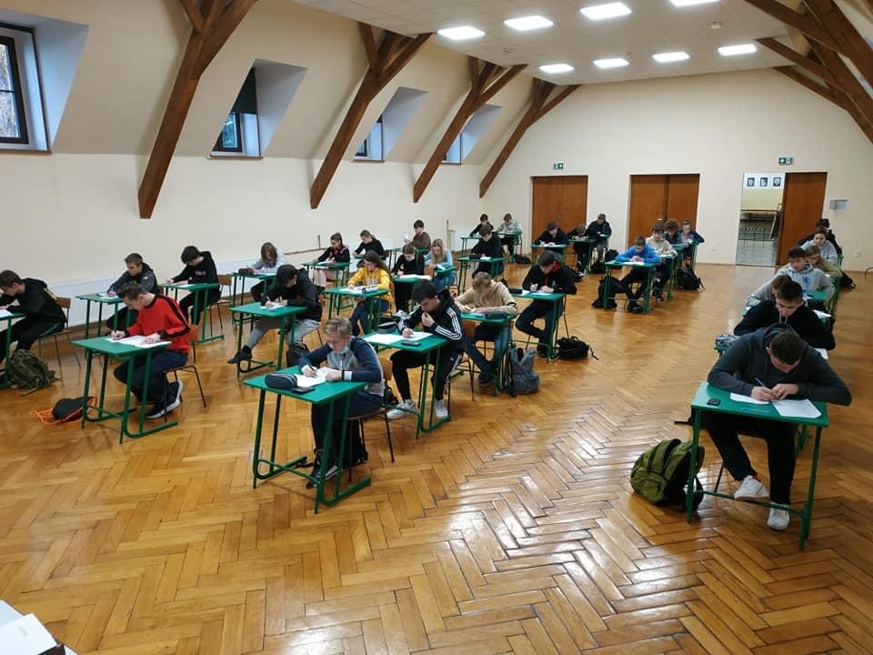 Pierwsza część – wykład konkursowy był przeprowadzony hybrydowo – uczniowie przebywający na kwarantannie uczestniczyli online, pozostali stacjonarnie. W wykładzie prowadzonym przez nauczyciela matematyki Lesława Lewszyka wzięło udział prawie 50. uczniów różnych klas.
