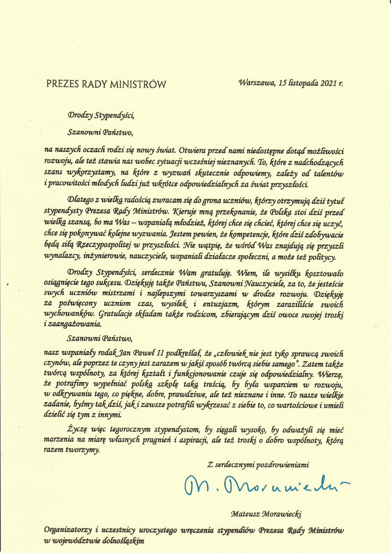 Życzę Wam, drodzy stypendyści, spełnienia marzeń i realizacji najśmielszych wyzwań. Niech to stypendium będzie dla Was tylko pewnym etapem na Waszej drodze w zdobywaniu wiedzy i dojściu do obranego celu.