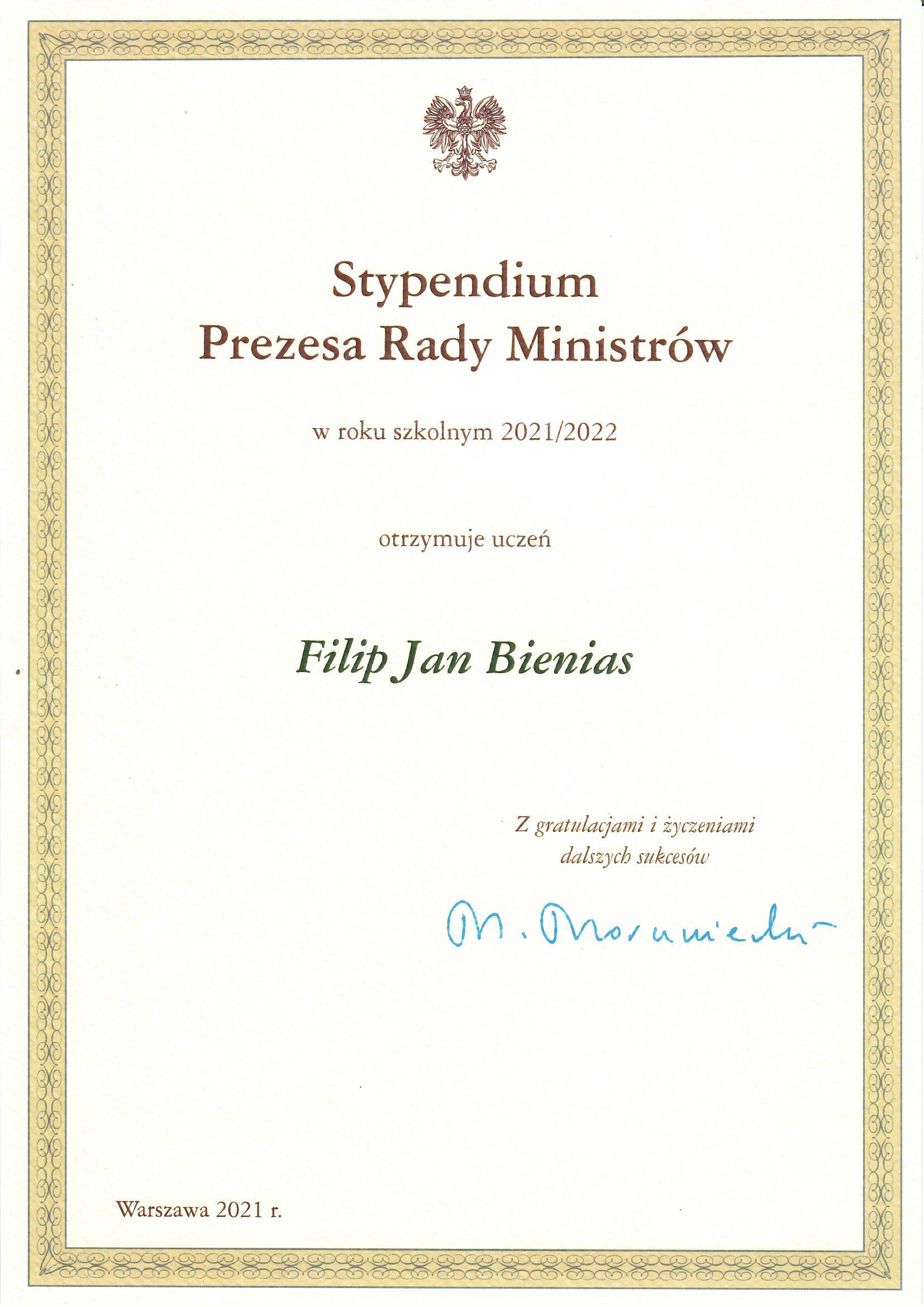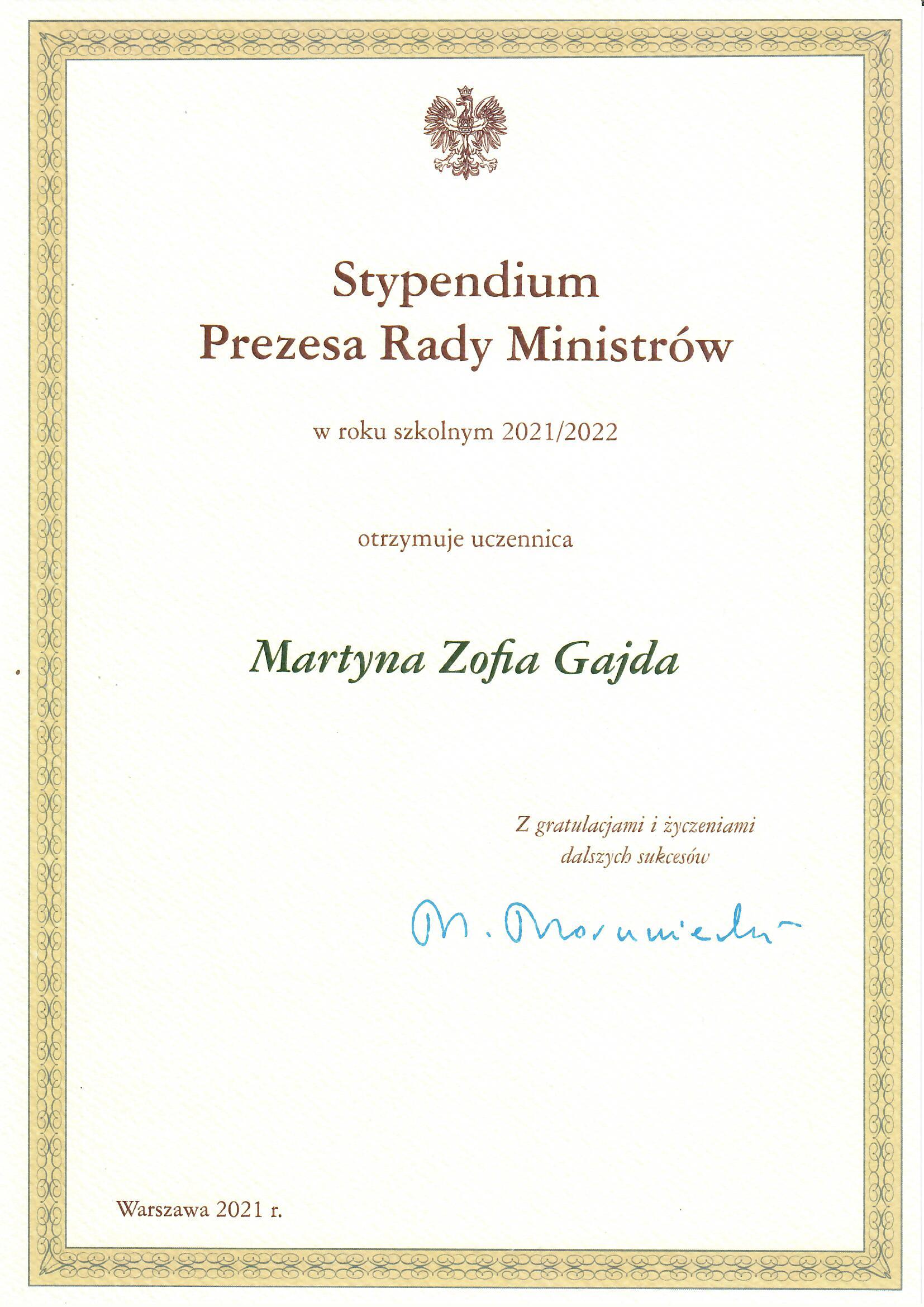 Z wielką przyjemnością i dumą informuję, iż dwoje uczniów naszej szkoły otrzymało stypendium Prezesa Rady Ministrów. Są nimi: Martyna Gajda z klasy 3AG oraz Filip Bienias z klasy 2A.
