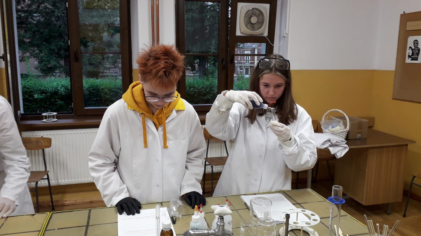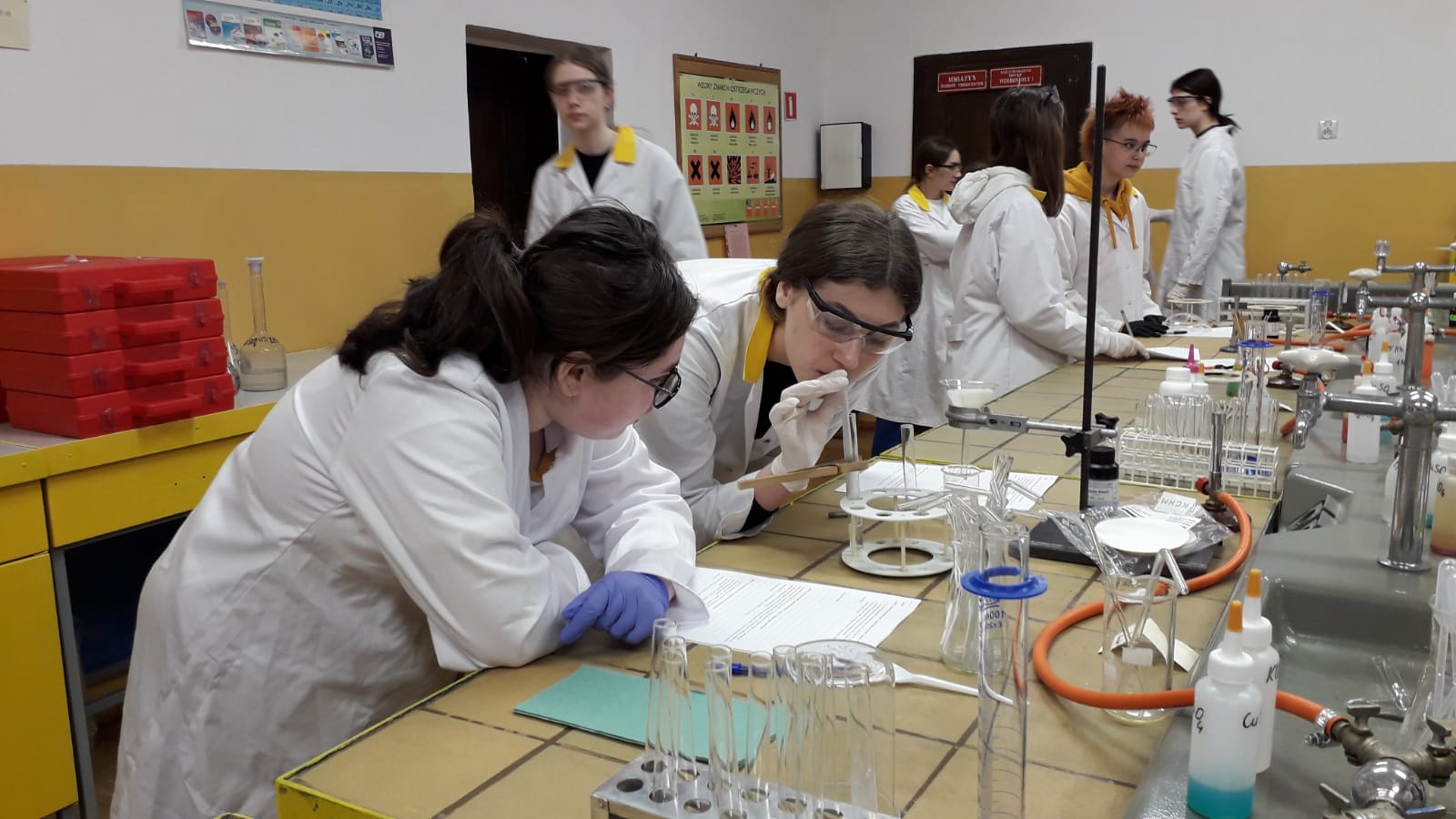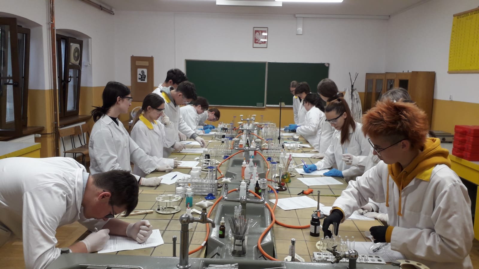 17 maja uczniowie klasy Ic z profilu biologiczno - chemicznego pod czujnym okiem nauczyciela chemii wykonali samodzielnie szereg doświadczeń obrazujących właściwości związków nieorganicznych. Zajęcia podsumowały trudny dział pt.;" Systematyka" i były doskonałą powtórką przed czekającą uczniów pracą klasową. Mamy nadzieję, że po zajęciach laboratoryjnych wiele trudnych zagadnień zostało rozjaśnionych. Uczniom, życzymy na pracy przysłowiowego połamania piór.
