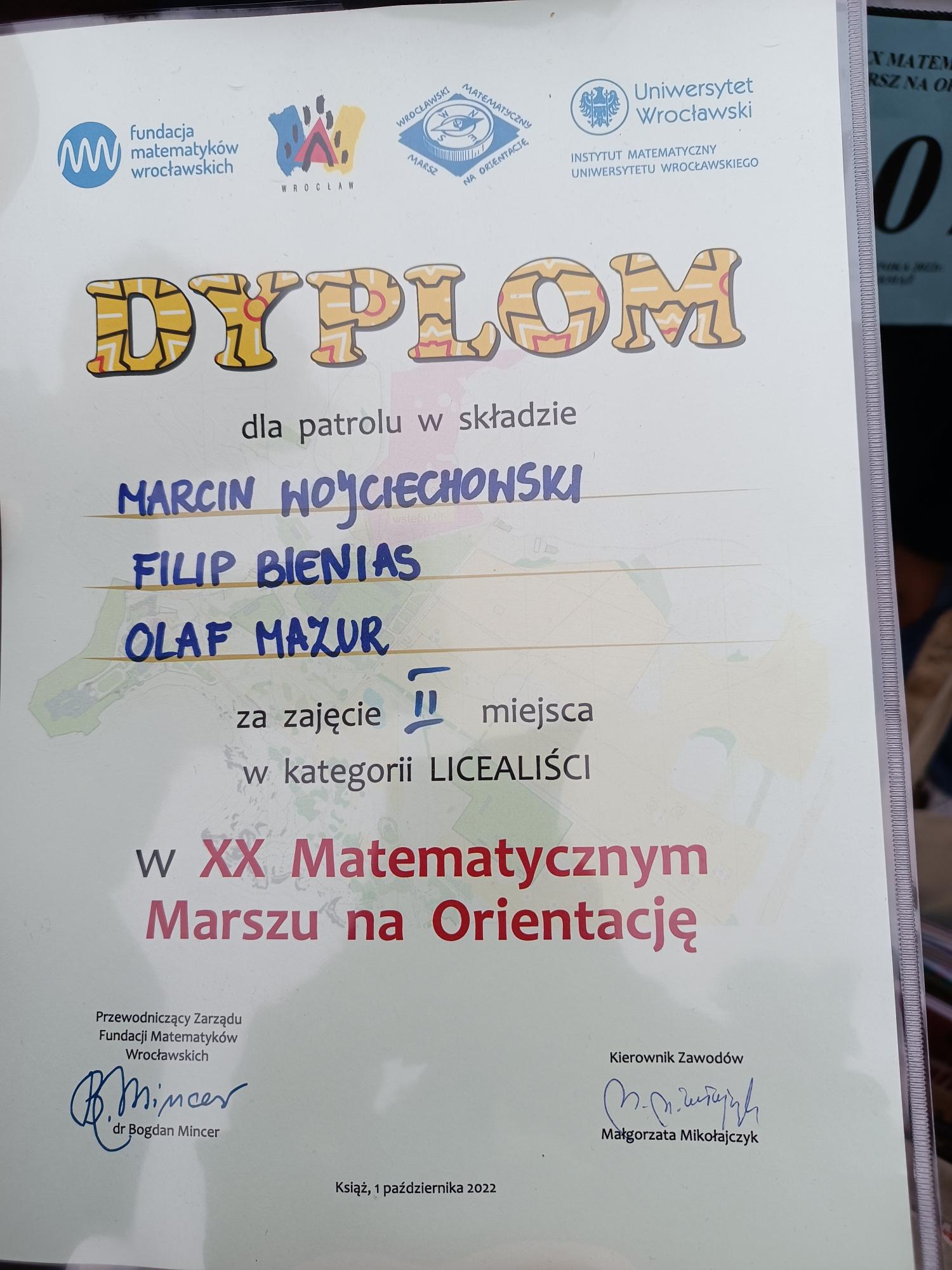 Warto zaznaczyć, że w tej kategorii startowało 90 patroli z najbardziej renomowanych liceów, nie tylko z Dolnego Śląska! Nasi uczniowie, zdobywając 1108 punktów, ulegli tylko o 3 punkty patrolowi z LO nr 3 we Wrocławiu, a pokonali m.in. patrole z XIV LO z Wrocławia, II LO z Wałbrzycha, Liceum Akademickiego przy Politechnice Wrocławskiej i II LO z Krakowa. Nasze dwa pozostałe patrole: Kuba, Artur, Emilia, Roksana, Wiktoria i Paweł osiągnęli również bardzo wysokie wyniki, plasując się w górnej części rankingu.