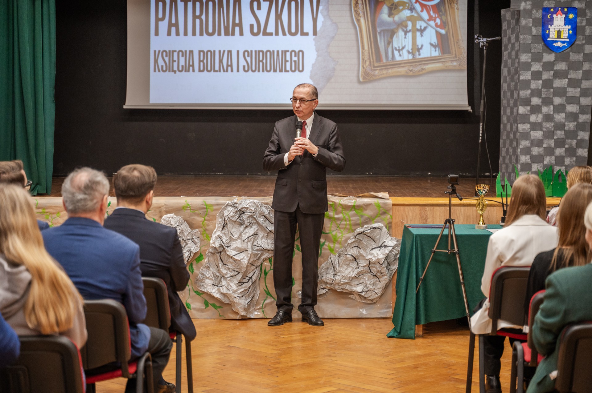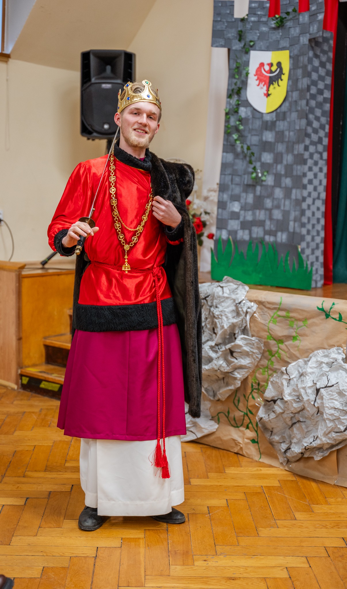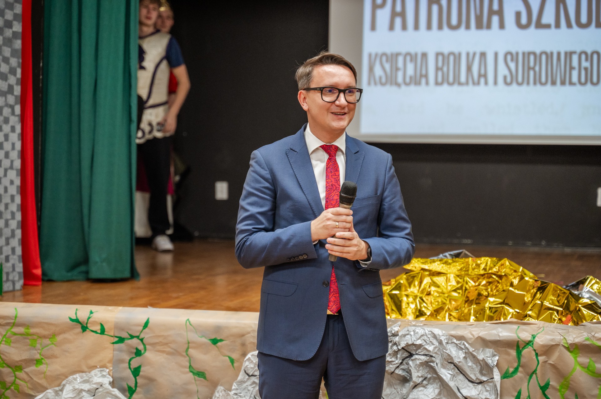 W czwartek, 12 grudnia wydarzyło się coś niezwykłego. Na korytarzach szkoły, później w gabinecie wicedyrektora, a na koniec w szkolnej auli pojawił się człowiek nie z tego świata i nie z tej epoki – Książę Bolko I Surowy, patron szkoły. Jak się okazało celem jego wizyty było zweryfikowanie czy młodzież, nauczyciele, dyrekcja oraz mieszkańcy i najznamienitsi obywatele Jawora nadal kroczą jego drogą, pielęgnują dawne wartości i odważnie stawiają czoła wyzwaniom współczesnego świata, jakie talenty może odnaleźć wśród żaków, co ich interesuje i bawi. Tak oto w skrócie można odnieść się do uroczystości i przedstawienia przygotowanego przez klasę III B.