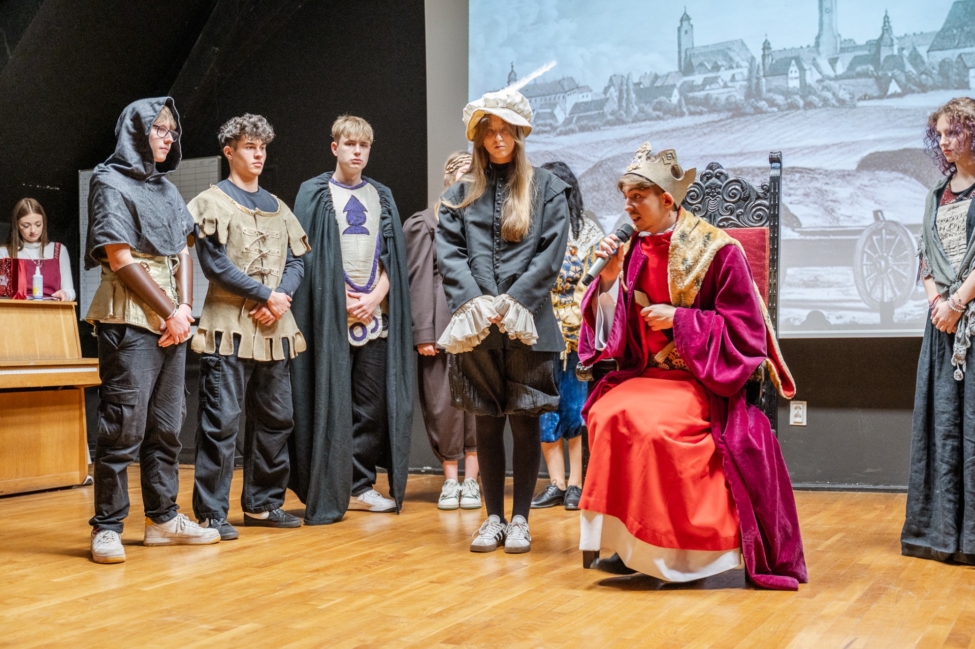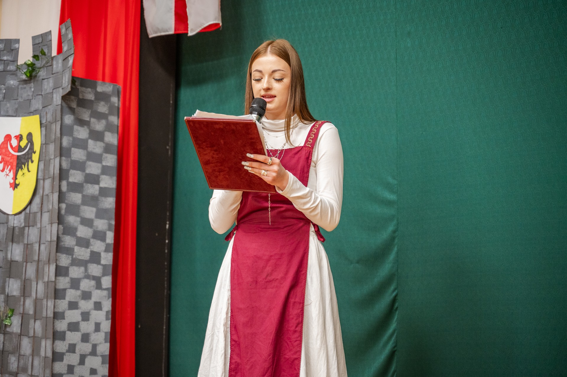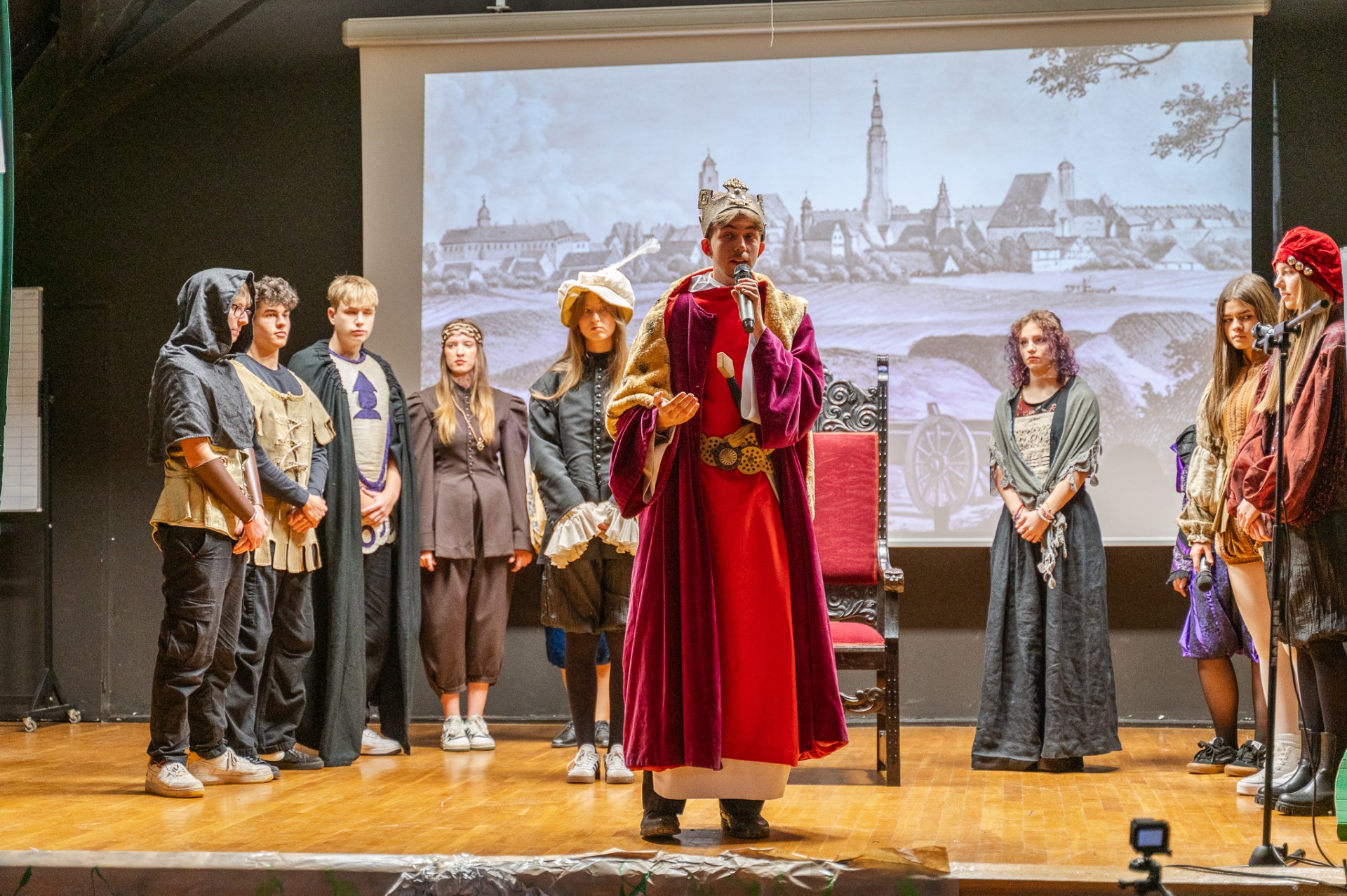 W czwartek, 12 grudnia wydarzyło się coś niezwykłego. Na korytarzach szkoły, później w gabinecie wicedyrektora, a na koniec w szkolnej auli pojawił się człowiek nie z tego świata i nie z tej epoki – Książę Bolko I Surowy, patron szkoły. Jak się okazało celem jego wizyty było zweryfikowanie czy młodzież, nauczyciele, dyrekcja oraz mieszkańcy i najznamienitsi obywatele Jawora nadal kroczą jego drogą, pielęgnują dawne wartości i odważnie stawiają czoła wyzwaniom współczesnego świata, jakie talenty może odnaleźć wśród żaków, co ich interesuje i bawi. Tak oto w skrócie można odnieść się do uroczystości i przedstawienia przygotowanego przez klasę III B.